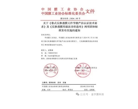 山东金宇膜科技发展有限公司是中国膜工业协会的会员单位,节能型反渗透膜行业标准的制定者。中国膜工业协会、中国膜工业协会标准化委员会于2024年2月6日批准《卷式反渗透膜元件节能产品认证技术要求》、《反渗透膜用湿法非织造布》两项团体标准予以发布。