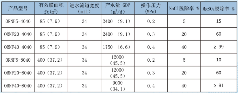 油水分离、印染废水、垃圾渗滤液等需要深度脱除COD的工艺。可选择ORNF-20和ORNF-40纳滤膜,渗透通量大,COD脱出率高,产水能耗低。