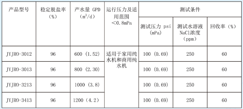 2.家用反渗透膜组件测试产水量为平均值,单支膜组件产水量误差在15%之内。